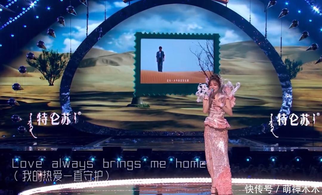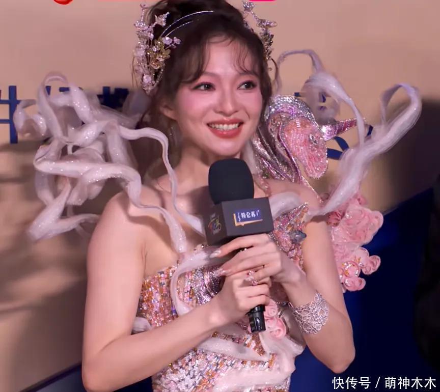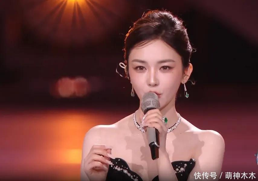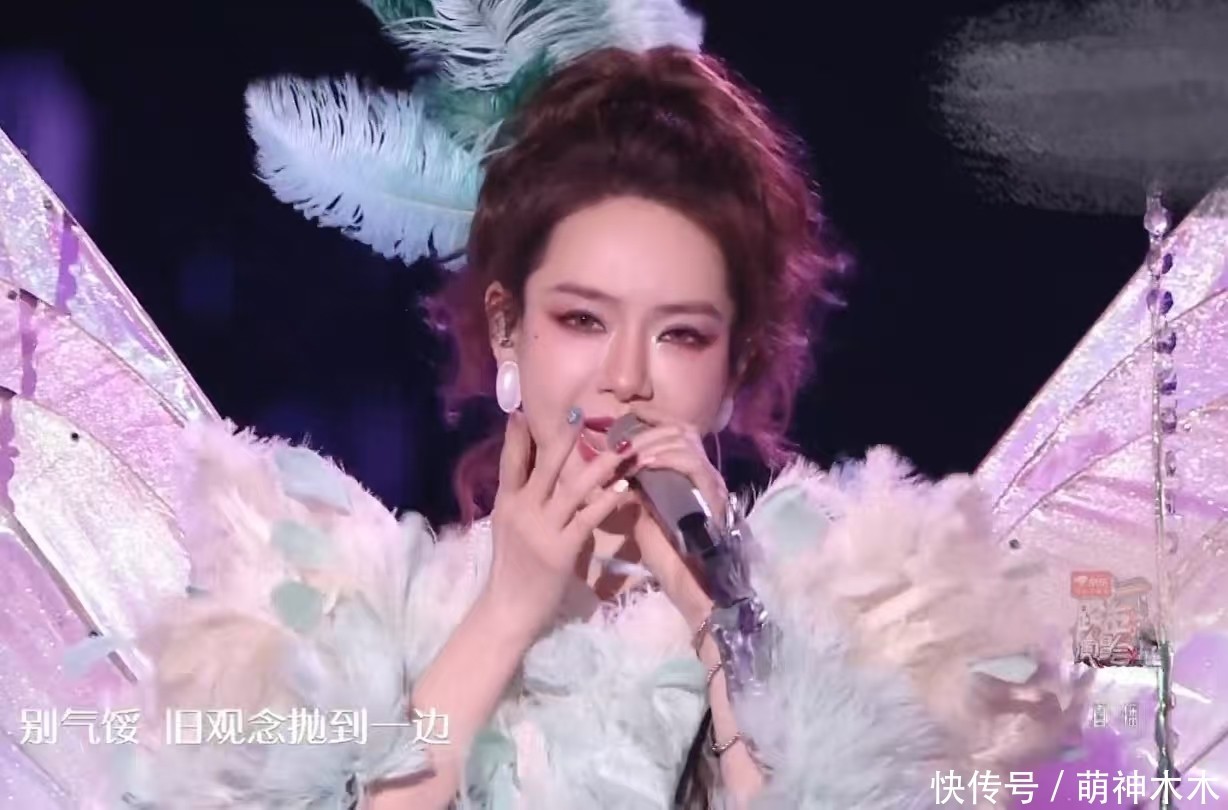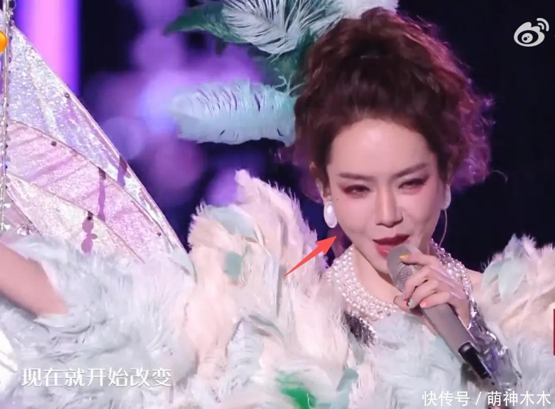 戚薇吊带长裙搭渐变绿色皮草大衣,看起来像一个“大鸡毛掸子”。上台表演时,整个造型很显老,羽毛的质感很差。蓬松的盘发加了绿色的大羽毛很过时,而戚薇的脸也十分僵硬肿胀,只要动起来面部肌肉就出现了各种断层,侧脸也能看到苹果肌膨得十分夸张。